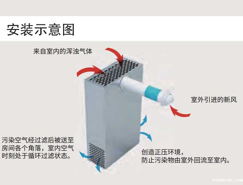 主要组成:排风口新风主机、进排风口、风管、过滤系统